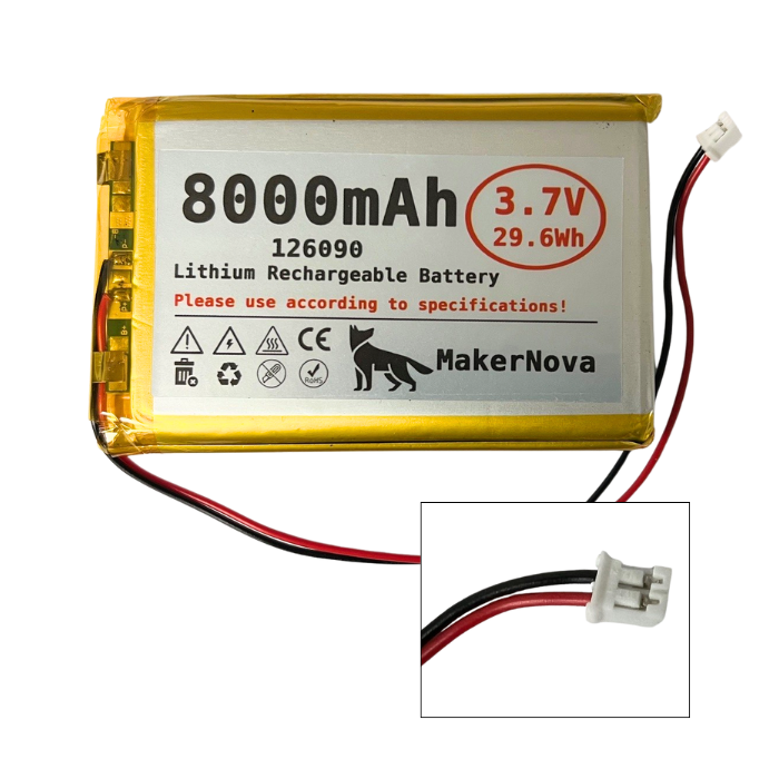 8000 mAh: (±2mm): 91.4*59.4*13.1 mm /3.60*2.34*0.52inch(L*W*H) - JST Type PH 2.0 Plug